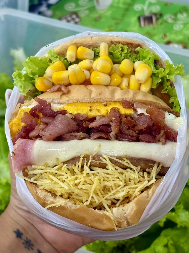 Pão, tradicional, bife, presunto, queijo, bacon, ovo, alface, tomate, batata-palha e milho